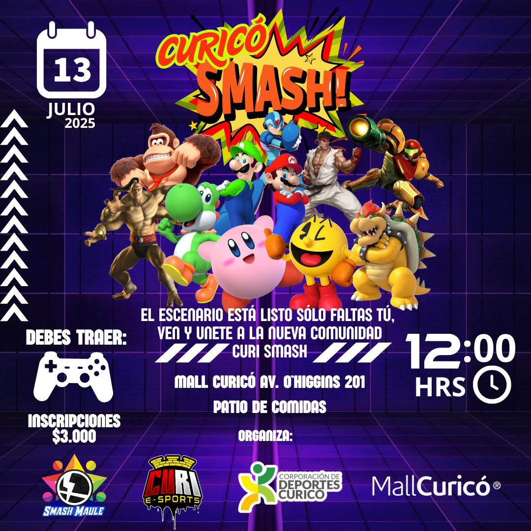 El próximo sábado 13 de julio, a partir del mediodía, el patio de comidas del Mall Curicó se convertirá en el centro de atención para los fanáticos de los videojuegos. La Corporación de Deportes, Mall Curicó y Curicó Esports se unen para ofrecer una jornada repleta de emoción, competencia y comunidad en torno al popular videojuego Super Smash Bros. La actividad es gratuita y está pensada para todo público, desde jugadores experimentados hasta quienes dan sus primeros pasos en el mundo gamer.