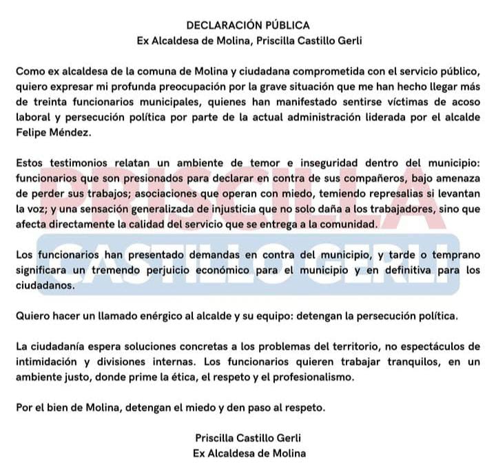 MOLINA.- En una encendida declaración pública, la ex alcaldesa de Molina, Priscilla Castillo Gerli, reapareció en el escenario político para denunciar lo que califica como “acoso laboral y persecución política” al interior del municipio bajo la actual gestión del alcalde Felipe Méndez. Según Castillo, más de treinta funcionarios le habrían hecho llegar testimonios que describen un ambiente de temor, presiones y amenazas dentro de la casa consistorial.