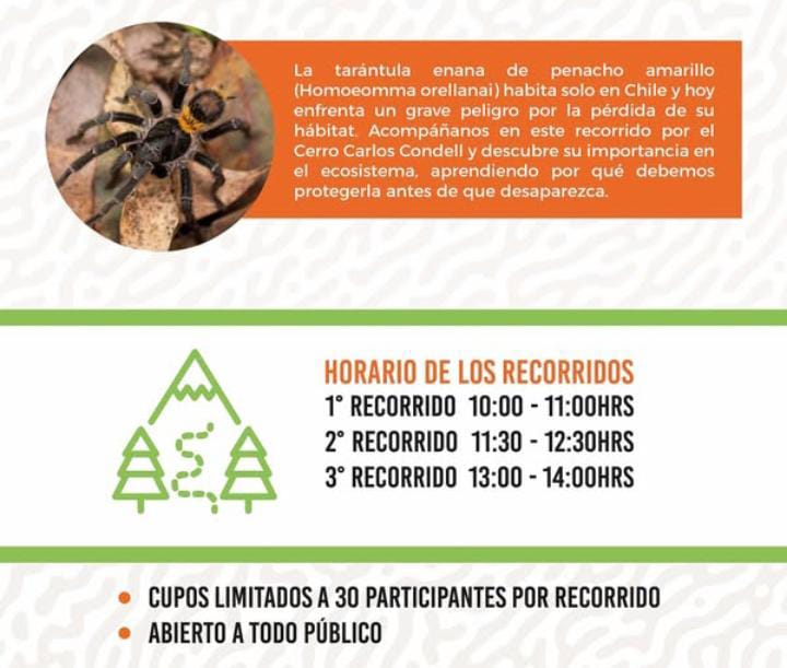 Este sábado 30 de agosto, la comunidad curicana tendrá la oportunidad de participar en una experiencia educativa y ambiental única en el Cerro Carlos Condell. Se trata de una jornada de recorridos guiados con foco en la tarántula enana de penacho amarillo (Homoeomma orellanai), especie endémica de Chile que habita exclusivamente en esta zona y cuya conservación se ha vuelto urgente. La actividad está abierta a toda la familia y tiene como propósito generar conciencia sobre la importancia de proteger a esta pequeña habitante del ecosistema local.