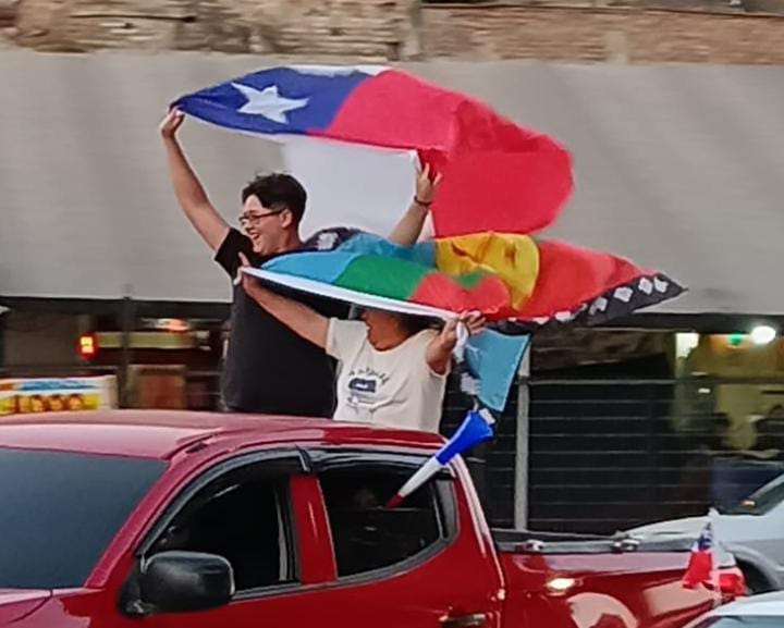 Entre las banderas chilenas y partidarias, apareció una bandera mapuche ondeando en medio de la celebración. Una imagen inesperada para varios, que rápidamente se convirtió en el comentario obligado de la noche. Lejos de generar rechazo, el gesto provocó aplausos y miradas de sorpresa.